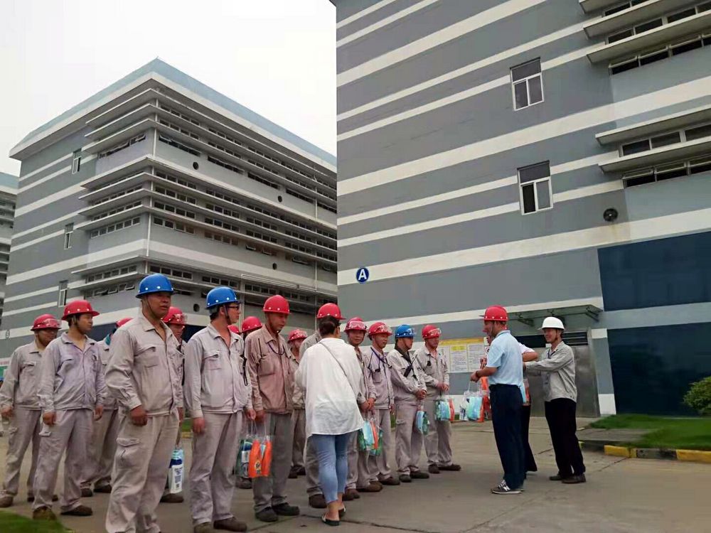 上午8点50分,一线员工代表在班长的指挥下,快速来到厂区指定地点,列队排开,精神抖擞,欢迎园区总工会的到来。园区领导们为大家送来了洗护套装、毛巾、风油精、花露水等夏季清凉用品,与一线员工亲切握手并将清凉用品一一送交大家手中,嘱咐大家注意防暑降温,并希望企业合理安排好员工的作息,抓好安全生产工作。